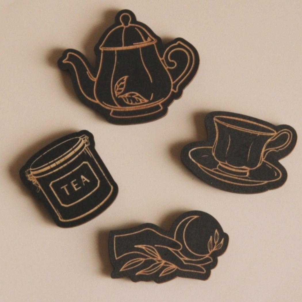 Made from high-quality 3mm Australian plywood that is sturdy yet lightweight, these beautifully crafted magnets feature a teapot, teacup, and tea jar—perfect for any tea lover, along with our signature logo. With strong magnets that hold securely, they’re both practical and charming, making you feel as though you're right here at the Cottage, enjoying afternoon tea with the resident witch!
